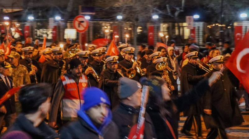 Cumhuriyet Meydanı’ndan başlayarak Valilik binası önüne kadar devam eden yürüyüşte, Çanakkale Boğaz ve Garnizon Komutanlığı Bandosu’nun çaldığı marşlar eşliğinde zaferin gururu ve coşkusu hep birlikte yaşandı.