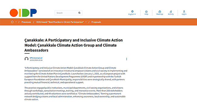 OIDP'nin resmi internet sitesinde “Awards” (Ödüller) ve ardından “Participate OIDP” (OIDP'ye Katıl) sekmeleri üzerinden erişilebilen “Proposals” (Başvurular) bölümünde, dünya genelinden yapılan tüm başvurular kamuoyunun incelemesine açık durumda. Bu yıl farklı ülkelerden toplam 176 proje başvurusu bulunurken, Türkiye'den 32 proje yarışmaya katıldı. Belediyemizin projesi de bu başvurular arasında yer alıyor. Tüm adaylıklar platform üzerinden incelenebiliyor ve kullanıcılar farklı ülkelerden yenilikçi uygulamaları keşfetme fırsatı buluyor.