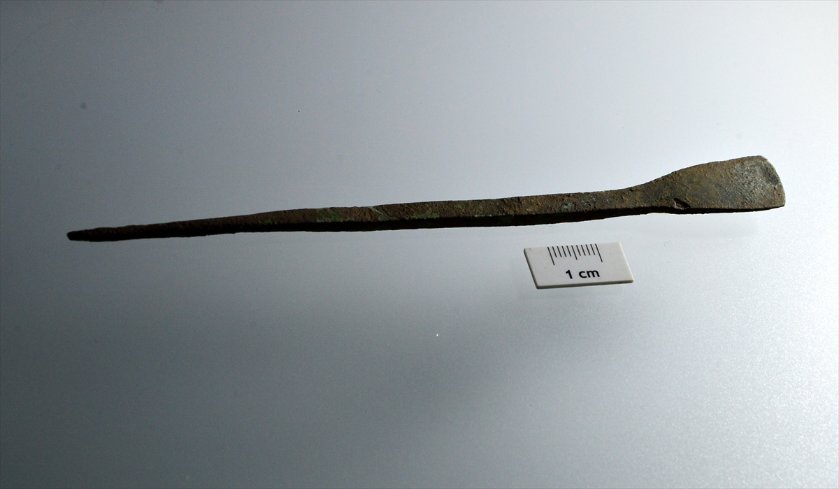 "Bu yılki kazılarda, arkeolojide 'stylus' olarak adlandırılan bin 800 yıllık bronz bir kalem bulduk. Bulduğumuz kalemin bir tarafı sivri diğer tarafı biraz daha yassı. Bunlar o dönemdeki bal mumu tabletlerin üzerine yazılıp notlar alınmak ve hesaplamalar yapmak için kullanılan kalemler. Bunlara 'stylus' diyoruz. Kalemin arka kısmındaki yassı kısım ile düzeltme yapmak için kullanılıyor. Yani şu anda günümüzde kullanılan silgi yerine geçiyor."