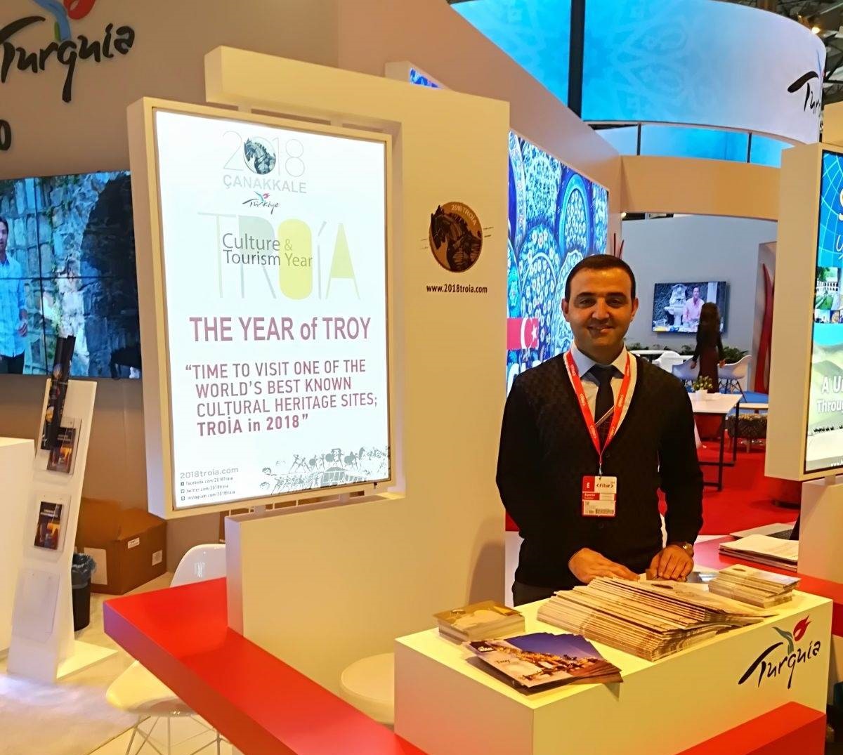 2018 Troya Yılına özel hazırlanan tanıtım kitapçığı ve broşürlerinin yer aldığı Madrid FITUR Fuarı’nda ÇOMÜ Turizm Fakültesinden Yardımcı Doç. Dr. Sinan Gökdemir ziyaretçilere Çanakkale ile ilgili bilgi veriyor.