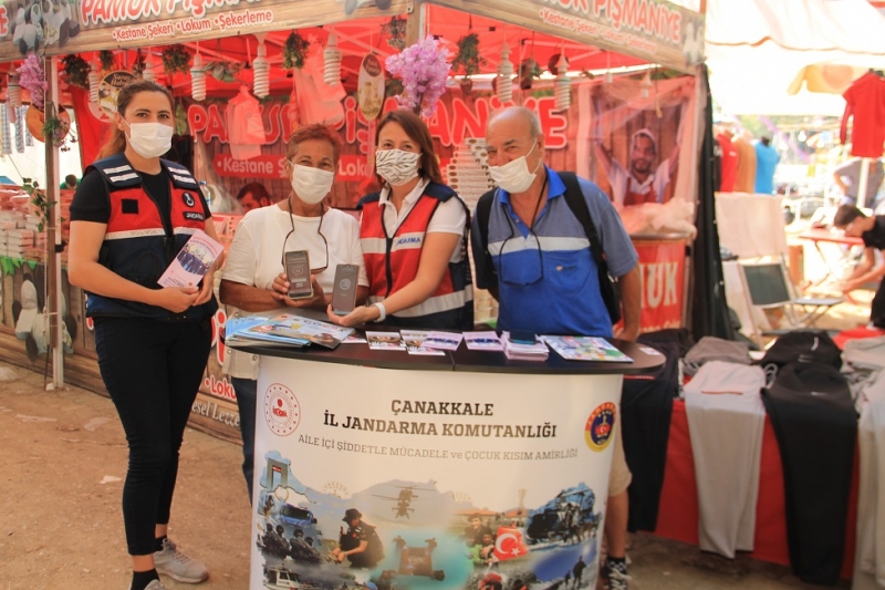 ‘Aile İçi ve Kadına Yönelik Şiddet ile Mücadele’ kapsamında; şiddete maruz kalındığında veya tanıklık edildiğinde izlenecek yol ve irtibat numaraları konularında yüz yüze bilgilendirme yapılmış, broşür dağıtıldı. Panayıra gelen çocuklara Jandarma Çocuk Dergisi ve boyama kitabı hediye edildi.