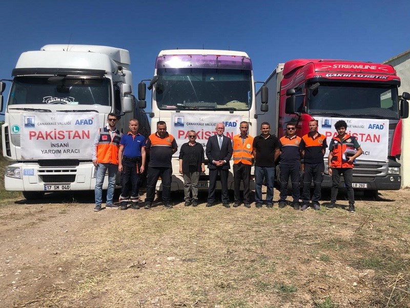 Sel felaketinde zarar gören Pakistan'daki afetzedelere ulaştırılmak üzere Çanakkale Valiliği öncülüğünde AFAD İl Müdürlüğü koordinasyonunda hazırlanan gıda ve temizlik malzemesi taşıyan 3 yardım tırı Pakistan’a uğurlandı.